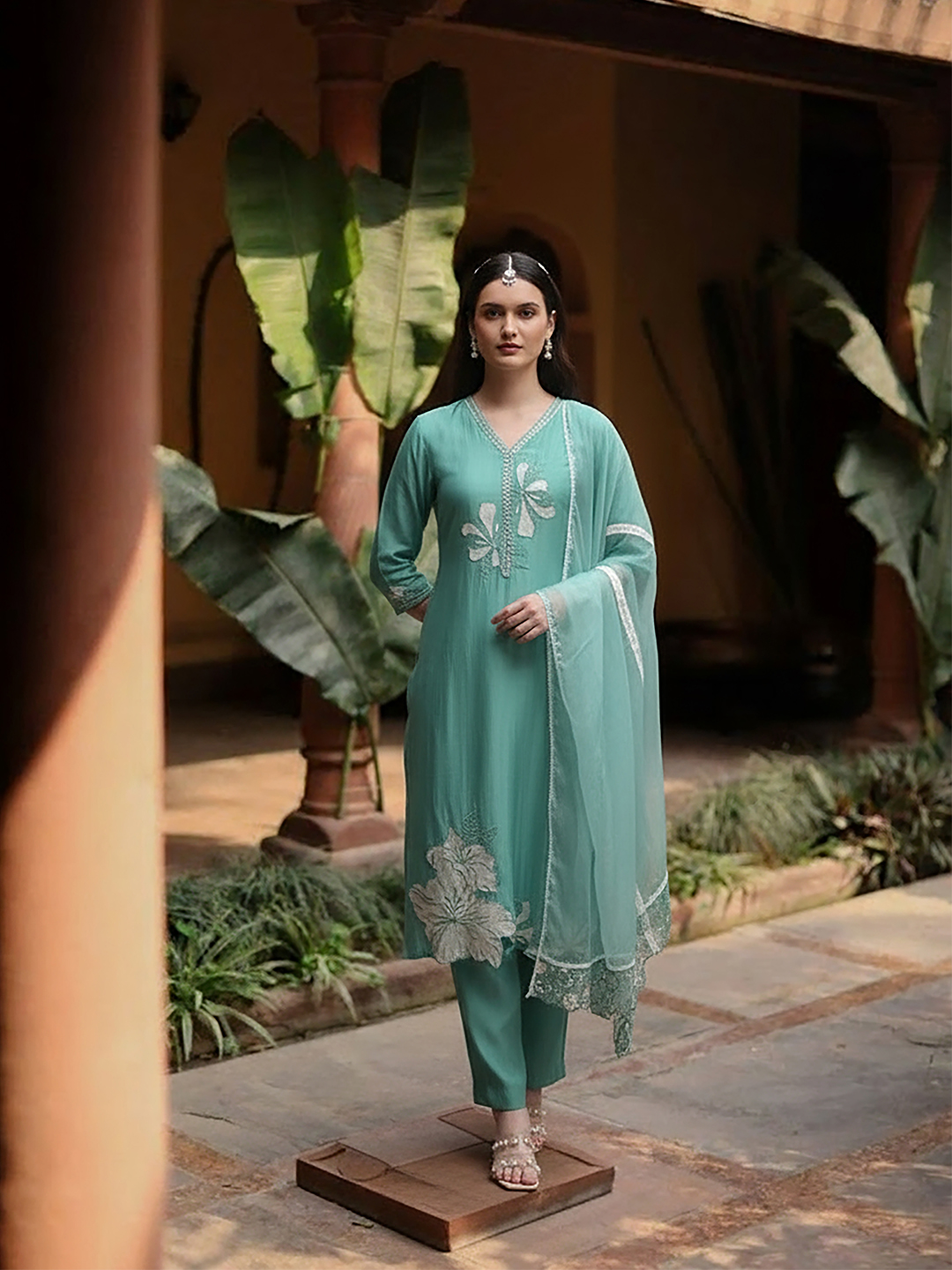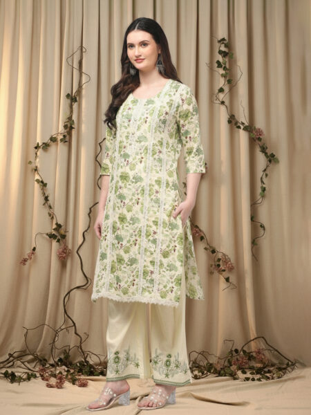 White & Green Printed Kurta with Palazzos & Dupatta Floral – Printed – White Kurta Straight Shape Round Neck Three-quarter sleeves Slip-On Closure