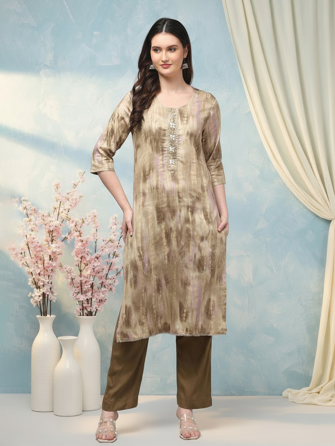 Olive Green, gold-toned and silver textured printed kurta with trousers and dupatta